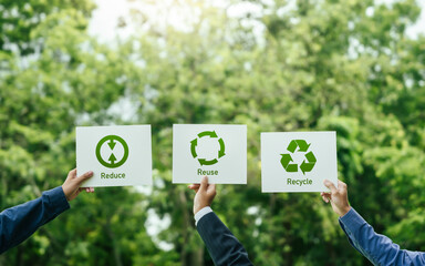 business team people planning and discussing on recycle reduce reuse policy symbol in office meeting room. Green business company