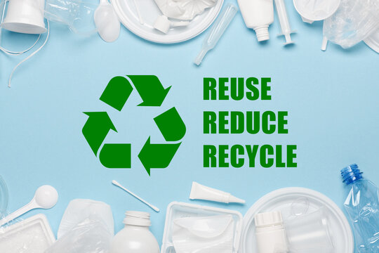Recycling symbol with reuse reduce recycle slogan surrounded by single-use plastic objects, packaging plastic waste products top view