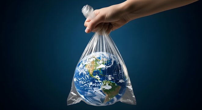 Hand holding a plastic bag containing the Earth globe, symbolizing environmental concerns and pollution.