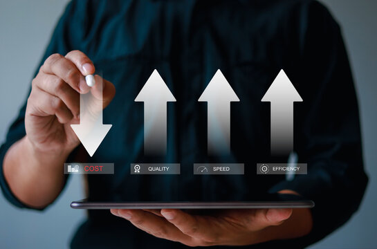 Quality control, Quality improvement and cost management visualization for success. Digital interface showcasing strategic planning and performance enhancement through innovation and decision-making.