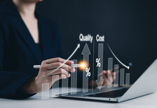 Cost and quality control concept. Businessman pointing virtual graph showing cost reduction and quality improvement for product optimization and customer satisfaction.