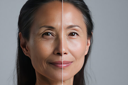 Compare before and after beauty treatment showing smooth skin and wrinkles reduction on mature woman face with natural expression