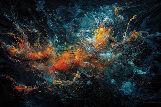 an abstract painting with orange, blue and black paint on the bottom half of the image is in full color