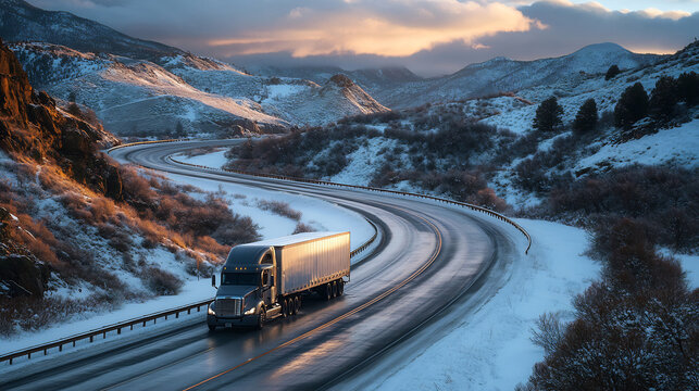 Reefer truck driving down a winding mountain road at dawn using a medium focal length shallow depth of field and cool color temperature to emphasize the curves and morning light