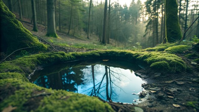 Small pool in a forest hollow reflecting bright moss and sky, soft natural vignette effect, tranquil harmony of green and blue tones