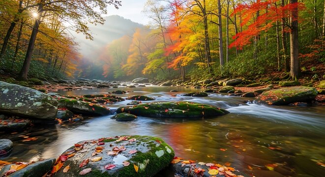 Serene autumnal landscape with vibrant foliage reflecting in the flowing river waters and morning sun