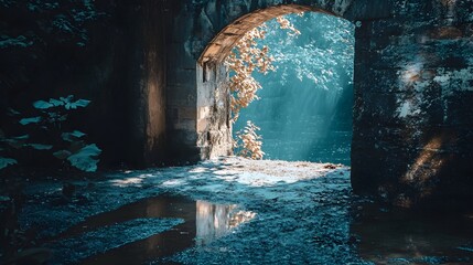 A stone archway leads to a mystical forest with sunlight streaming through the trees and reflecting in the water below.