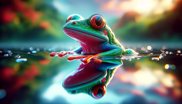 A close-up of a frog with its reflection in crystal clear water, depicted in a whimsical, animated art style.