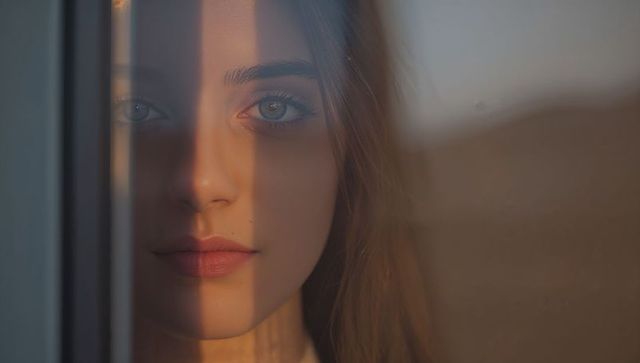 Melancholic young woman gazing through window with golden light stripe and soft reflection