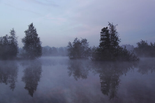 Foggy mountain landscape with calm lake and tree reflection at dawn