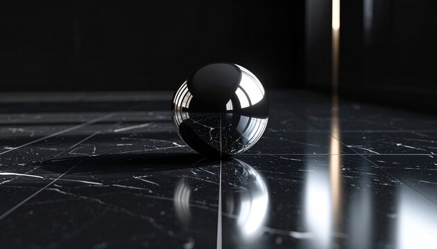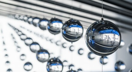 Metallic chrome spheres levitating, reflecting light with sleek geometric precision on transparent surface