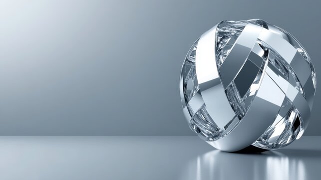 A gleaming abstract sculpted metal sphere composed of interlocking geometric segments rests on a reflective surface with soft studio lighting