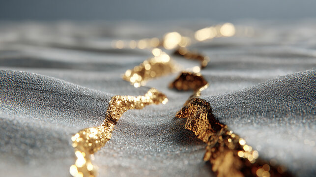 A single gold line slices through undulating gray sand dunes, creating a striking contrast. Hyperrealistic lighting accentuates the smooth texture of sand and the metallic gleam of the line.