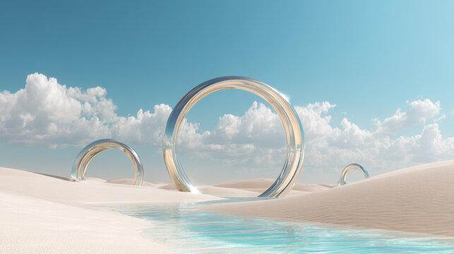 Futuristic abstract desert landscape with golden sand, reflective water, and metallic rings under a bright blue sky