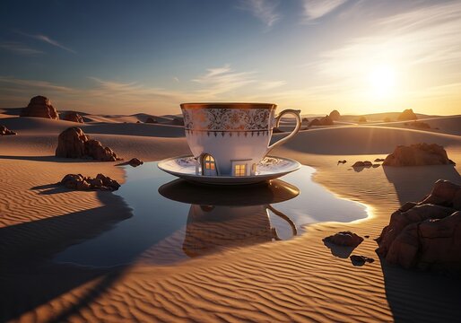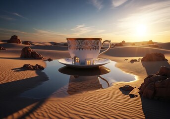 Surreal desert landscape with oversized teacup, reflective water and tranquil golden sunset evoking whimsical