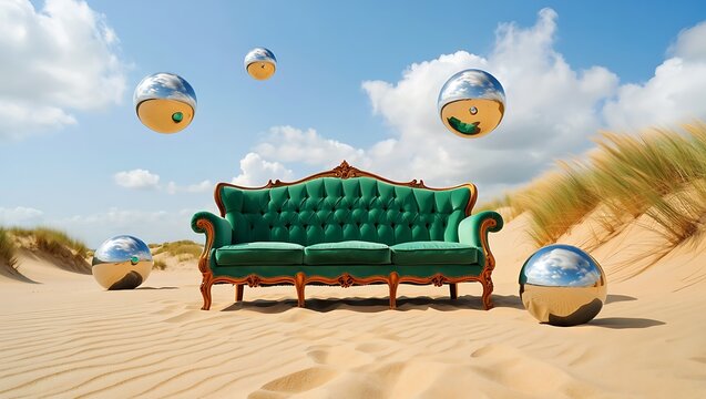 Desert landscape at golden hour with reflective chrome sphere floating above sand dunes