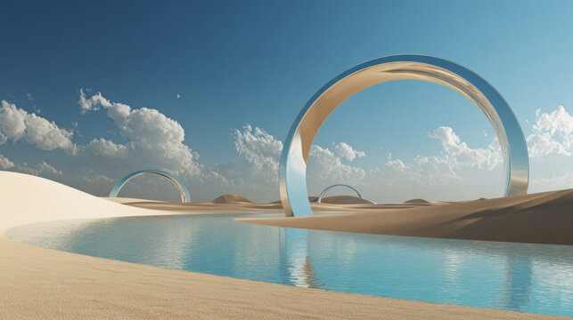 Futuristic abstract desert landscape with golden sand, reflective water, and metallic rings under a bright blue sky