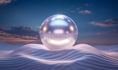 Shiny reflective orb resting on subtle sand dunes under a blue and orange sunset sky, creating a surreal and abstract landscape
