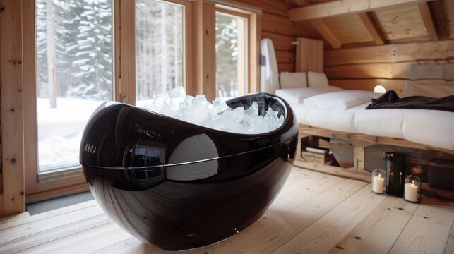 Modern ice bath featuring a sleek black freestanding bathtub filled with bubbles, set against a marble floor.