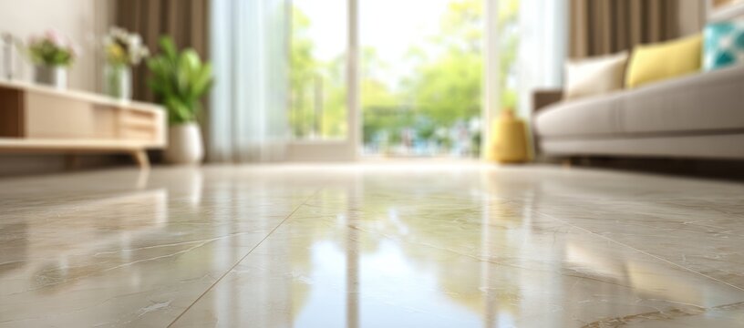 Blurred view of a light beige tile floor in a modern living room with a view