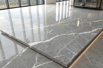 Close-up on luxury polished granite stairs, shiny floor in modern interior. Premium decorative stone surface, hard-wearing, easy to clean, sleek staircase design. Renovation solution for home,