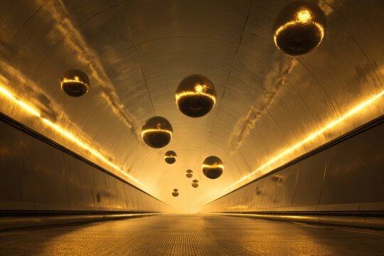 Golden tunnel with floating orbs and light emitting from the end of the passageway