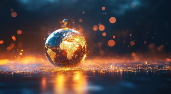 A shimmering, metallic globe atop a golden orb rests on a fiery, reflective surface, encircled by bokeh lights and dark, smoky ambiance