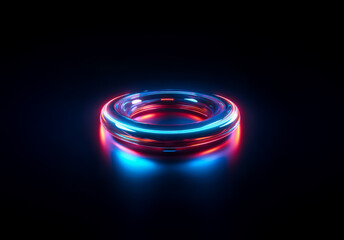 Shenzhen, China - Unknown Date : A luminous ring with vibrant blue and red neon lights stands out against a dark backdrop.  The metallic torus shape reflects light, creating a futuristic and dynamic v