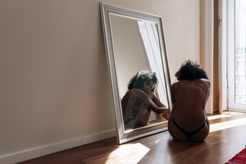 Melancholic ethnic young woman on floor beside large mirror with no pants