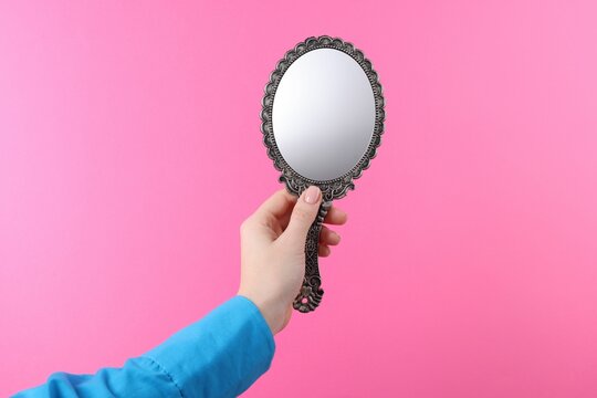Mature woman looking at her reflection in mirror with hands on cheeks