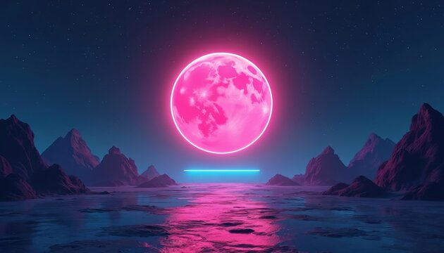 Pink neon moon shines over a rocky alien landscape with reflective water and starry sky. A blue light bar sits on the horizon. Futuristic synthwave scene.