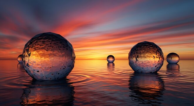 Golden glass sphere glowing on reflective table at sunset, minimal abstract and serene concept