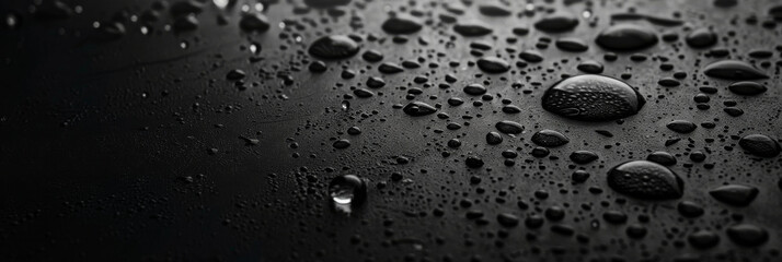 Macro view of clear water droplets beading up on a dark gray waterproof fabric, showcasing hydrophobic textile technology