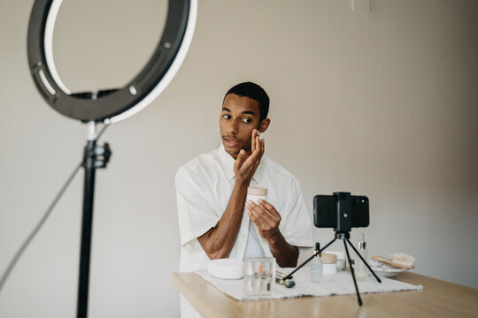 Young man doing beauty routine video tutorial at home