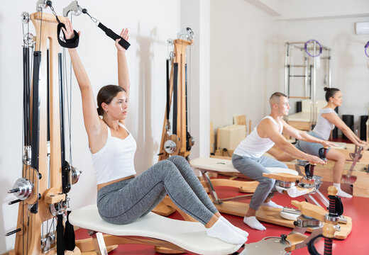 Woman performing pilates exercises on reformer apparatus in gym
