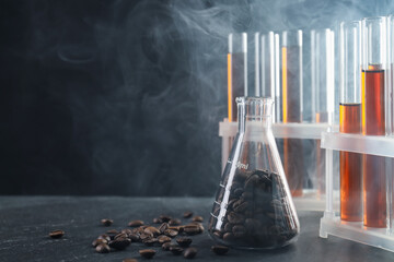 Laboratory glassware with coffee, beans and smoke on black table, closeup. Space for text