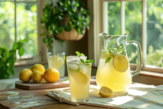Refreshing iced lemonade with mint in a sunlit kitchen.