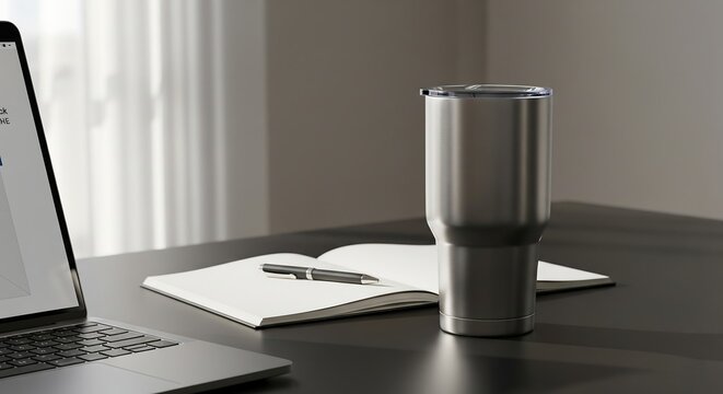 image of a cup filled with dark coffee, resting on a brown leather notebook, alongside scattered coffee beans and a laptop computer with a detailed display.