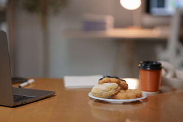 Freshly baked donuts and takeaway coffee cup creating cozy atmosphere on wooden desk with laptop, suggesting a quick break during busy workday in a modern office environment
