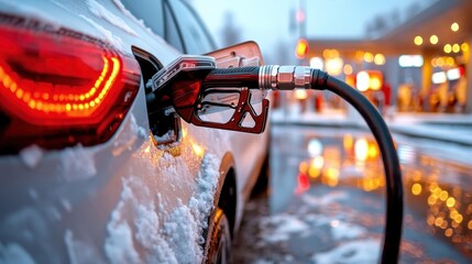 A car is refueled in a wintry setting, where snow lightly coats the surroundings, emphasizing the contrast between outdoor elements and the functional aspects of transportation.