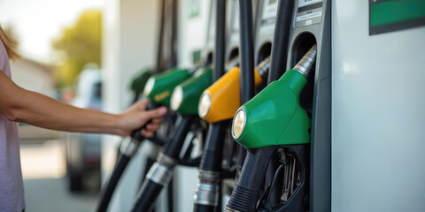 Woman refueling car at gas station. Person fills vehicle with fuel. Close-up view of fueling process. Modern gas station environment. Transportation concept. Cost of fuel. Current petrol industry