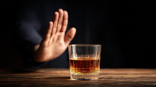 A person is refusing a glass of whiskey, symbolizing abstinence from alcohol or making a healthy choice.