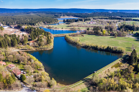 Germany, Lower Saxony, Goslar, Aerial view of UpperÔøΩHarzÔøΩWater Regale in spring