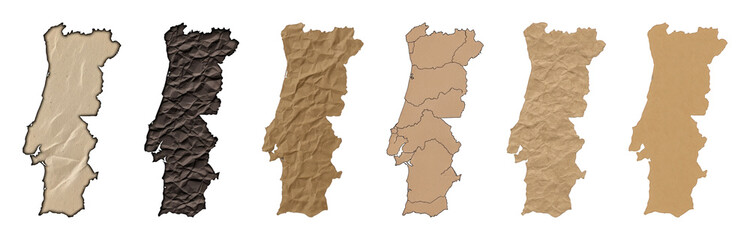 Portugal map set including crumpled, flat, and outlined regional paper textures isolated. Geographic country design elements.