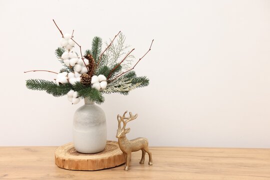 Beautiful composition with fir tree branches in vase and reindeer figure on wooden table near white wall indoors, space for text. Winter decor