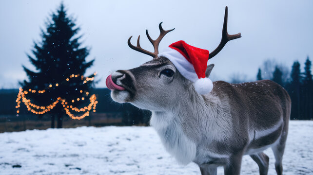 A charming reindeer wearing a Santa hat playfully licking its nose in a snowy landscape adorned with twinkling lights, capturing a festive holiday spirit.