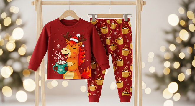 Red pajamas with cartoon reindeer holding cocoa mug, hanging on rack. Festive pattern with cup illustration. Represents comfort, holiday, celebration