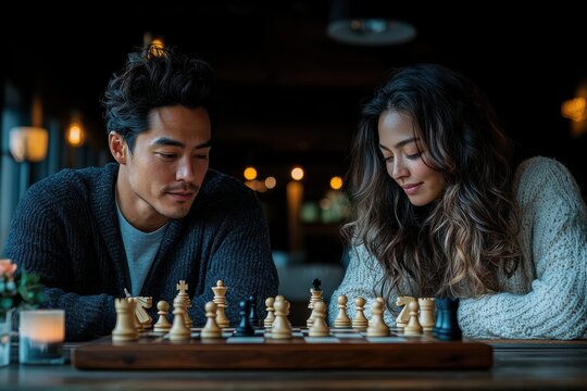 A couple enjoys an intimate moment in a cozy café, sharing warmth and conversation under soft lighting that enhances the mood of romance and connection.