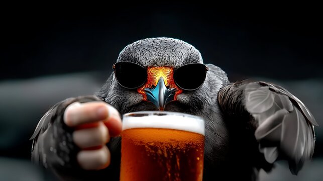 A cool bird wearing sunglasses enjoys a cold beer in a relaxed indoor setting