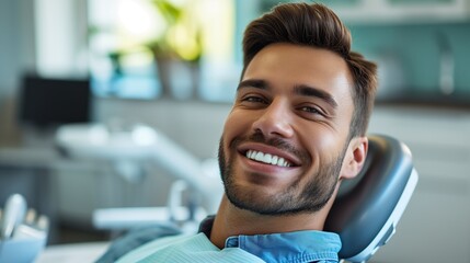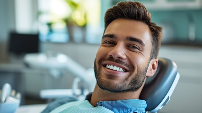 A smiling male patient sitting in the dentist chair in a dental clinic, photo-realistic style, bright, modern office background, concept of dental care. Generative AI